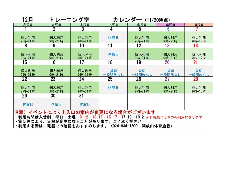 2025.11.28 お知らせ 体育館 12月 宝来屋ボンズアリーナ トレーニング室 利用可能カレンダー 12月 宝来屋ボンズアリーナ トレーニング室 利用可能カレンダー 12月_page-0001ダウンロード