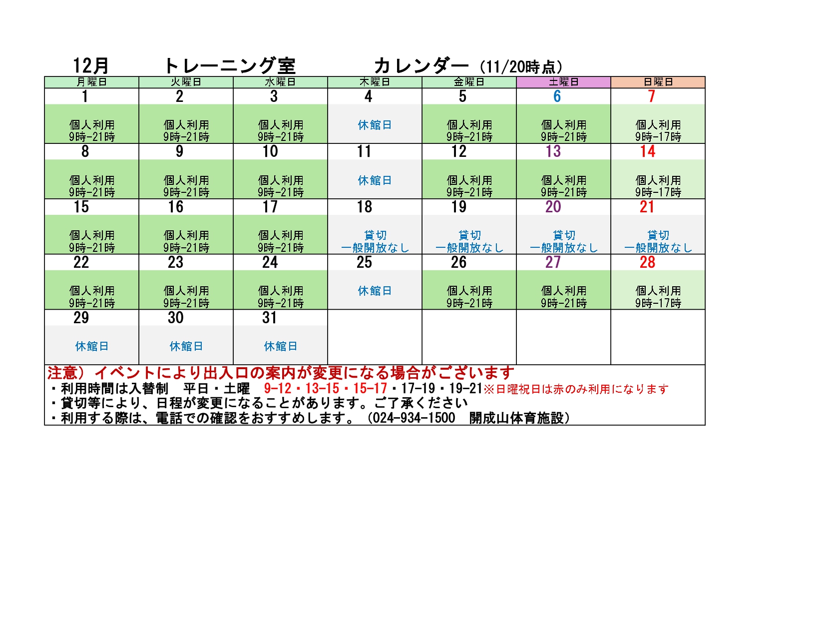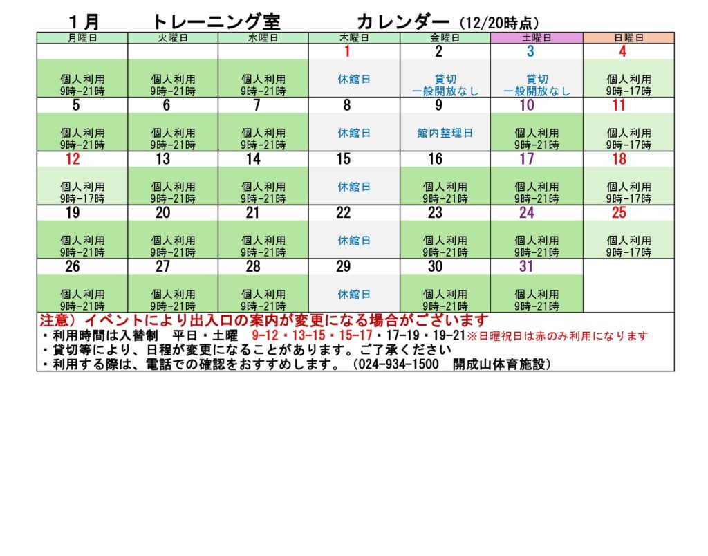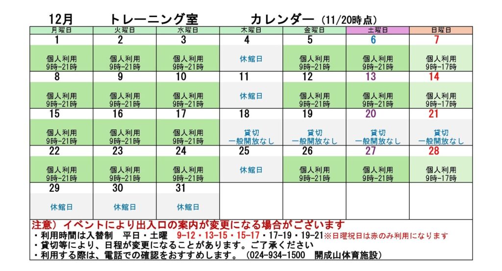 2025.12.21 お知らせ 体育館 12月・ 1月 トレーニング室 利用可能カレンダー 12月 宝来屋ボンズアリーナ トレーニング室 利用可能カレンダー 1月 宝来屋ボンズアリーナ トレーニング室 利用可能カレンダー