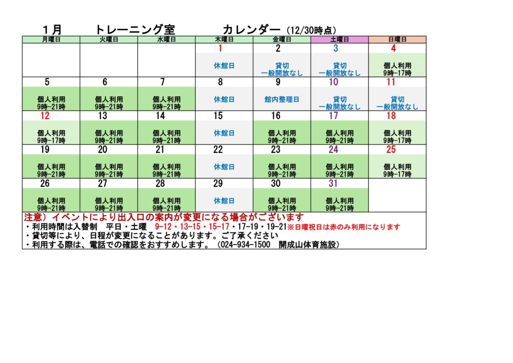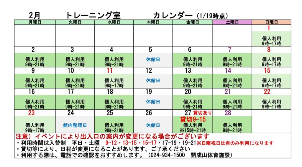 2025.12.21 お知らせ 体育館 1月・ 2月 トレーニング室 利用可能カレンダー 1月期 宝来屋ボンズアリーナ トレーニング室 利用カレンダー 2月期 宝来屋ボンズアリーナ トレーニング室 利用カレンダー