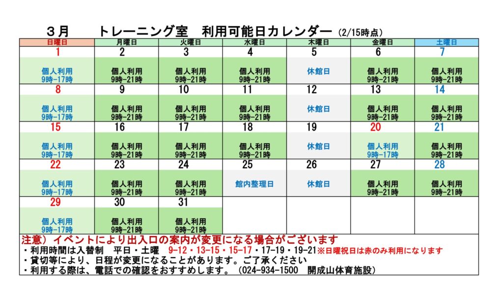 2025.12.21 お知らせ 体育館 2月 3月 トレーニング室 利用可能カレンダー 2月期 宝来屋ボンズアリーナ トレーニング室 利用カレンダー 3月期 宝来屋ボンズアリーナ トレーニング室 利用カレンダー