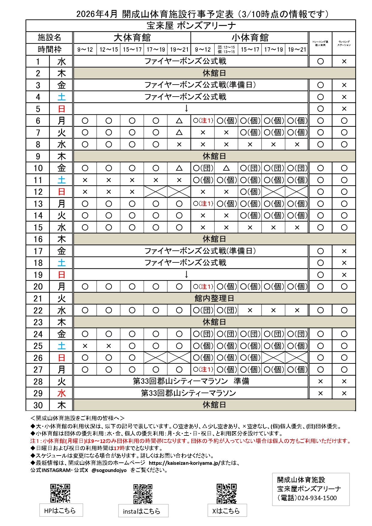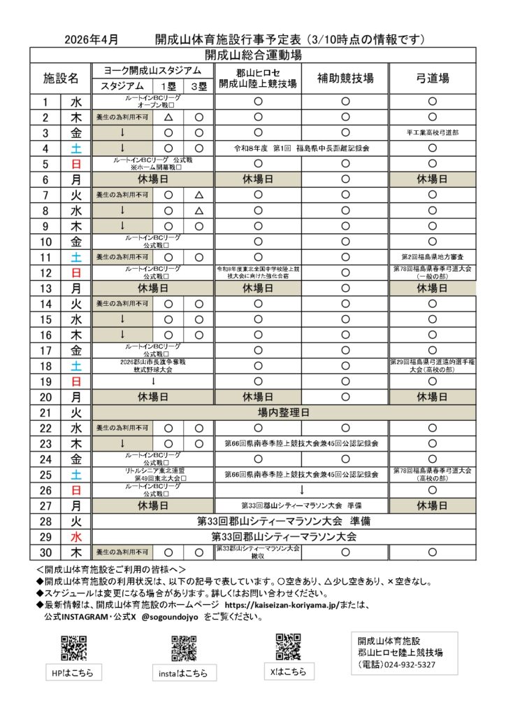 令和8年4月開成山体育施設行事予定表
