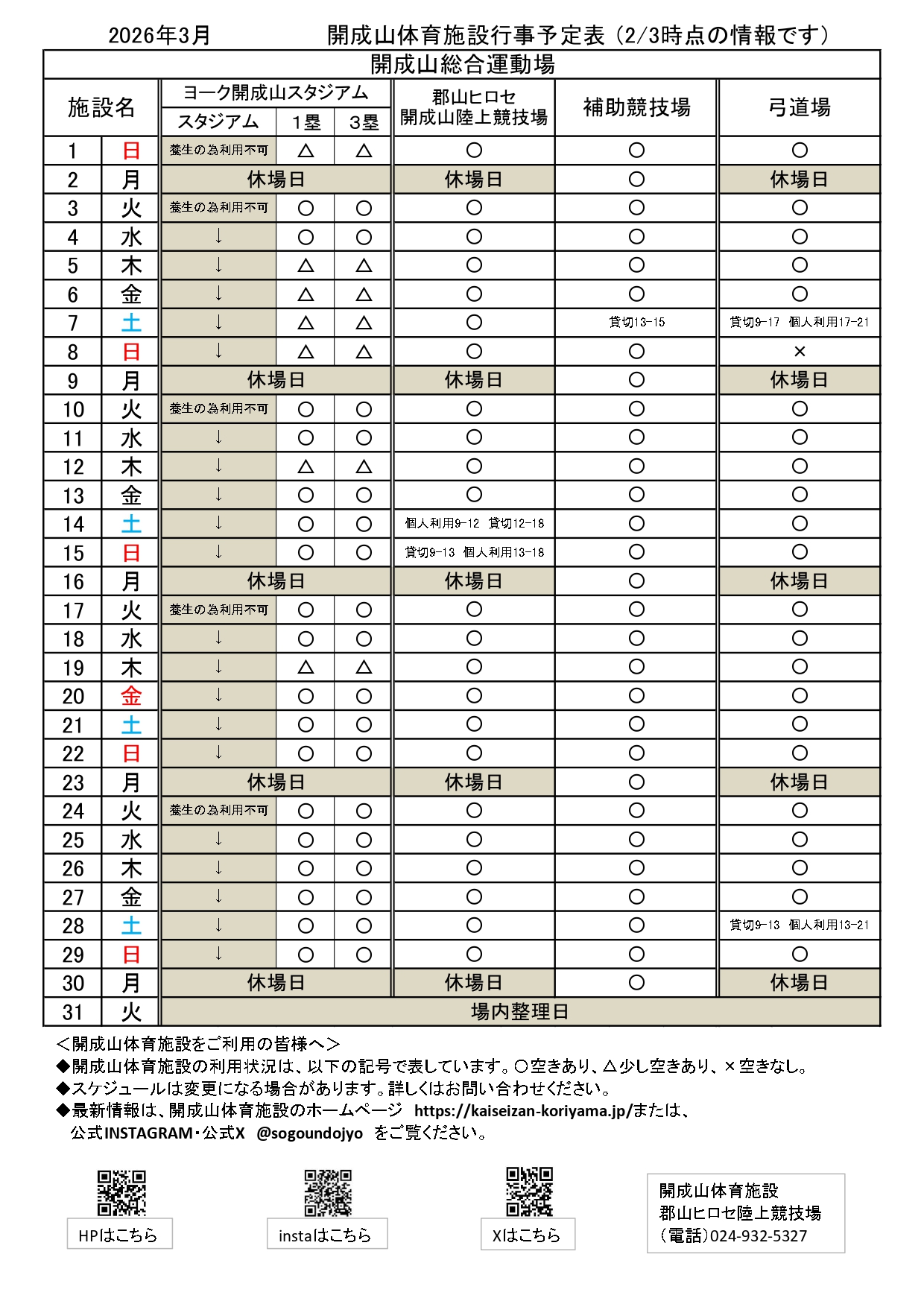 - 2団体での利用に限ります。受付で「利用許可書」を提示し、施設職員の確認を受けてください。(スタジアムの使用は大会利用に限ります。)